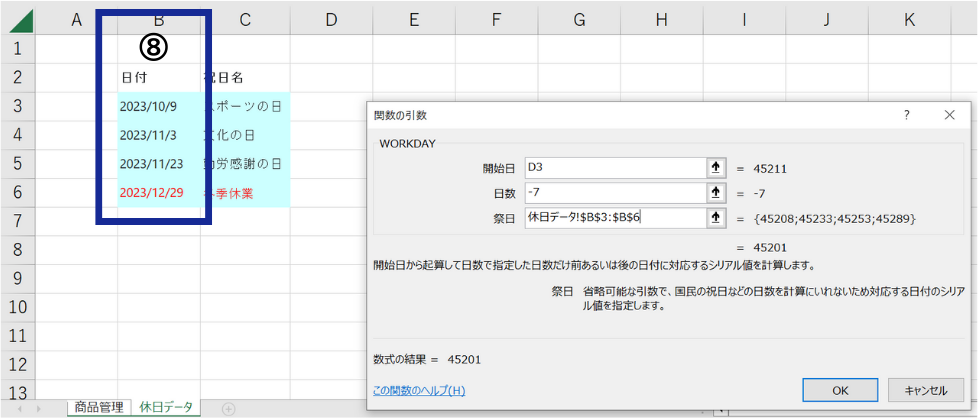 また今回は、7営業日前の設定のため⑦にて「-7」と入力しましたが、〇営業日後の場合はマイナスをつけず入力することで求めることができます。
