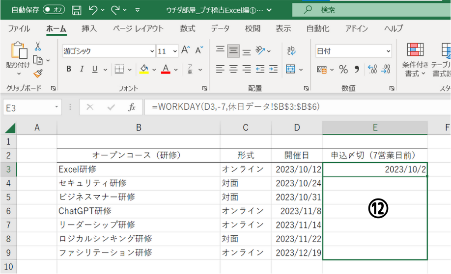書式を修正してオートフィルで各研修の申込〆切を入力してみましょう。