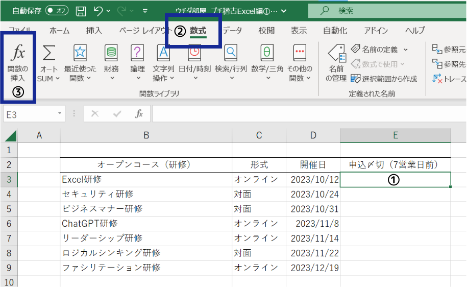今回は、PRACTICE1と同じく弊社が開催するオープンコース(研修)の申込締め切りを例に実践します。週末は水曜日と木曜日と仮定して設定します。簡単なので一緒に挑戦してみましょう!
