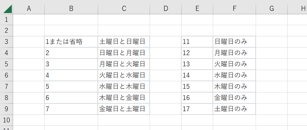 「週末」にはExcelで設定されている数値で週末を指定します。下記がその値になります。