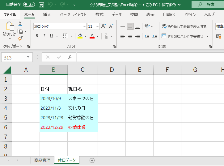 STEP1で作成した休日データシートに移動し、日付列全体を選択します。(今回は休日データ!$B$3:$b$6です。)