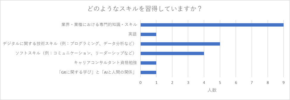 「どのようなスキルを習得しているか」では、主に実際の業務やスキル向上に直結する内容を選択されていることがわかります。昨今の時代背景からか、「デジタルに関する技術スキル」も次いで選択する人が多くなっています。